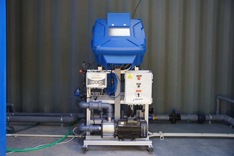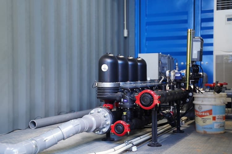 豊北ウィンドファームで導入されている精密潅水は、地中に潅水チューブを埋め、根に直接潅水を行う「SDI(Sub-surface drip irrigation)」という方式です。精密な潅水を管理するのは、知能を搭載した潅水システム「ネットビート™️」です。元は梨園だった傾斜が特徴の土地の山腹にあるコンテナハウスには、ネットビート™️を主軸とし、水と液肥を与えるシステムハブがあります。